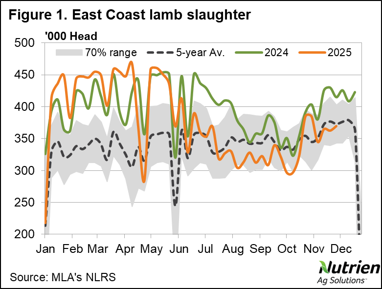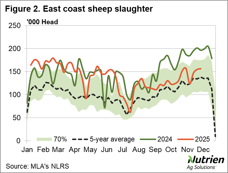 We can compare to last year however. Figure 1 shows that East Coast lamb slaughter has been higher in the first half of the year than in the preceding half. The five-year average shows this is not normally the case.