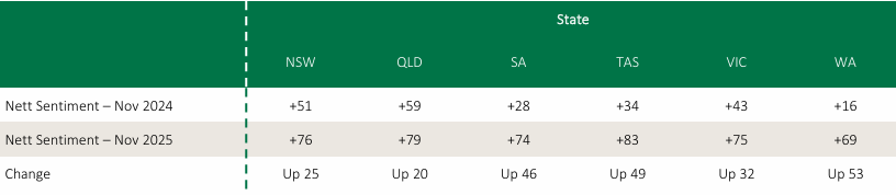 These are the largest year-on-year sentiment gains nationally and align closely with improved seasonal conditions and renewed rebuilding confidence in those regions. Importantly, while the uplift elsewhere was less dramatic, all states recorded stronger sentiment year-on-year, reinforcing that optimism is now a genuinely national story rather than one confined to specific production zones.
