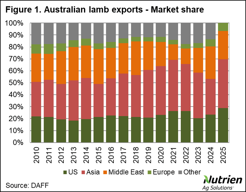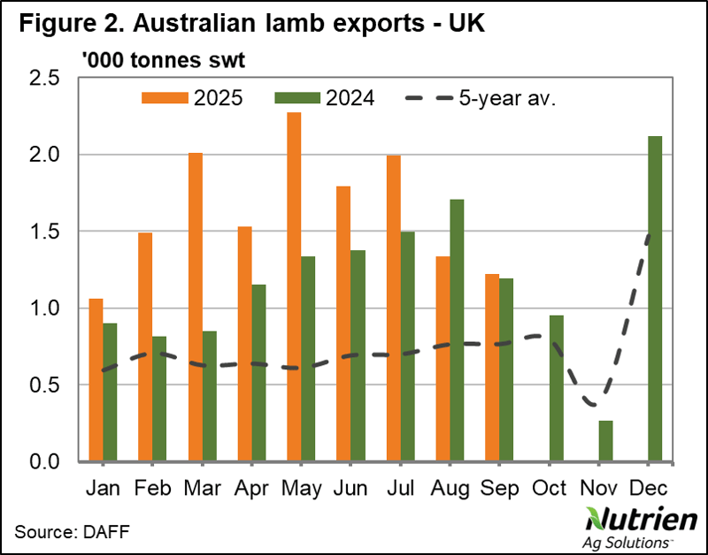 Much of the decrease in sheepmeat exports can be attributed to Australia’s current domestic production, with both sheep and lamb slaughter trending well below year-ago levels for 2025 so far. When it comes to the US, having been across many non-coastal states myself in recent weeks, the lack of beef in the country remains a hot topic, but there is no lamb on any menus I’ve seen, which could indicate that further growth potential is limited regardless of the supply-demand equation in the US itself.