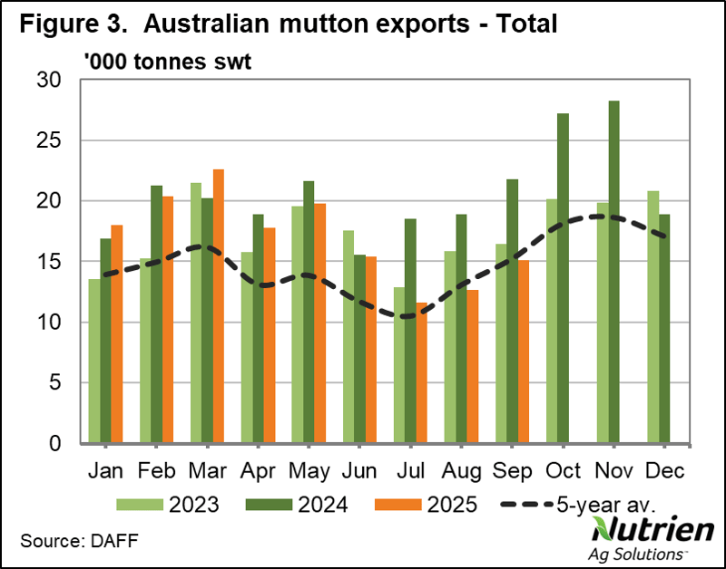 Meanwhile, in mutton, China continues to hold a significant majority market share, but they imported 72% less year-on-year in September, taking its year-to-date tally 18% lower. Malaysia, on the other hand, sits in second place in terms of Australian mutton imports for the year-to-date and increased its September volume by more than 80%. Mutton imports into the UK increased by more than 120% in September and are up more than 50% for the year-to-date compared to 2024.