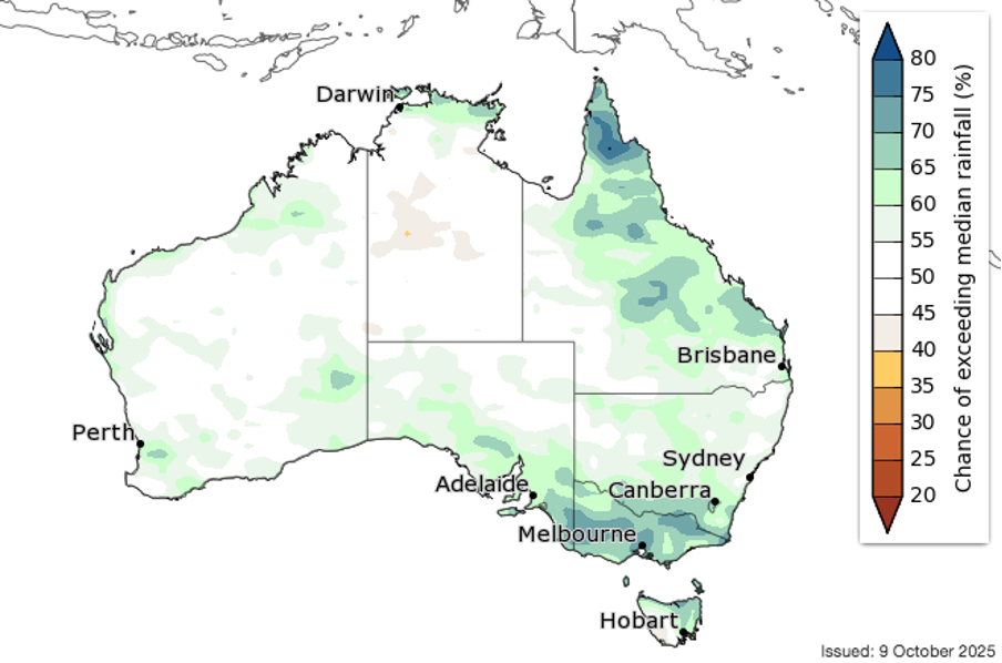 At the same time, the seasonal rainfall outlook suggests that grass availability will not be a limiting factor for many producers this spring. The Bureau of Meteorology’s November to January map points to a 60 to 80 per cent chance of above-median rainfall across much of the eastern seaboard, extending into southern Queensland and northern New South Wales. These conditions favour strong pasture growth, improved weight gains, and lower reliance on supplementary feed which are all factors that enhance trading margins. In previous dry seasons, feed costs or limited paddock capacity often forced earlier turn-off or lower target weights, eroding potential profit. This year, the rainfall probability and pasture outlook provide a handy alignment of feeding potential and market opportunity.