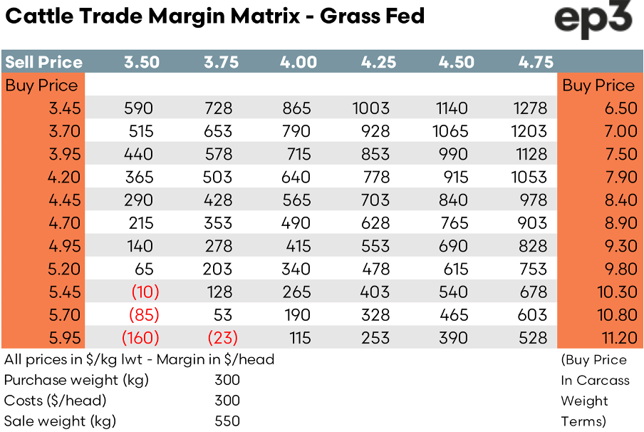 The trade model illustrated by Episode 3’s “Cattle Trade Margin Matrix – Grass Fed” helps frame the opportunity in numerical terms. The example assumes a restocker or backgrounder purchasing a 300 kilogram steer and feeding it on grass until it reaches 550 kilograms live weight, with a cost allowance of $300 per head for expenses such as animal health, transport and labour. The key variable, of course, is the buy and sell price per kilogram live weight, which together determine the eventual margin. The matrix shows that at a purchase price of 470 ¢/kg live weight, a level that matches current restocker yearling steer values, the margins remain positive across a range of sale price outcomes.