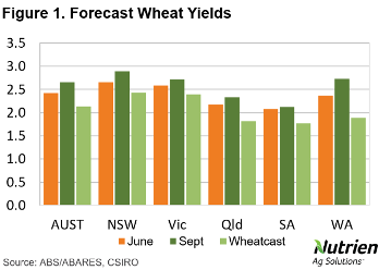 • Wheatcast has yields close to finalised at levels lower than ABARES September Crop Report