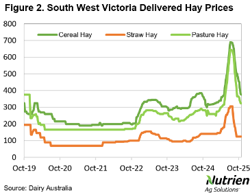 This was when there was plenty of media covering crops being cut for hay, but prices generally fall at this time of year. We can see in Figure 2 that as of the end of October, cereal hay prices remained around $70/t above the same time last year. This suggests that supply is still yet to overwhelm demand.