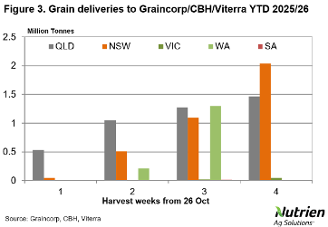 Harvest picked up pace in NSW and WA last week (Figure 3) with over 1 mmt delivered into NSW GrainCorp sites. East coast receivals were around 1.6 mmt below the same week last year, which could suggest yields are lower. Harvest could also just be running a week behind due to the weather. We’ll know in the coming weeks.