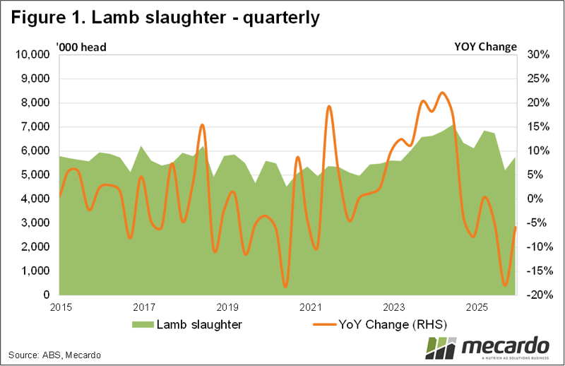 Figure 1 shows National lamb slaughter was up for the quarter but well down year on year. With 5.113 million head of lambs going over the hooks, December quarter lamb slaughter was down 5.8% on 2024 and 15.1% on 2023. Annual lamb slaughter for 2025 finished at 24.56 million head, down 6.9% on 2024.