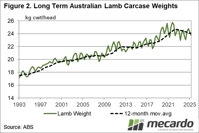 Another pointer towards a shift to flock rebuild is higher carcass weights. Figure 2 shows average carcase weights were 23.8kgs/hd in December, up from 23.1 in December 2024, and the second highest December figure on record. The 12-month rolling average is still in decline however, and we are likely to see this turn during 2026.