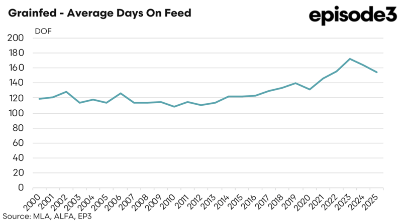 While still historically elevated, this decline represents a moderation from the record levels reached in recent years. The broader trend highlights the structural evolution of Australia’s grainfed sector, where average feeding periods have steadily increased from around 120 days in the early 2000s. This upward shift has been largely underpinned by the expansion of long-fed Wagyu and premium beef programs. The easing recorded in 2025 therefore reflects a cyclical adjustment rather than a structural reversal, signalling a recalibration in response to changing economic conditions.