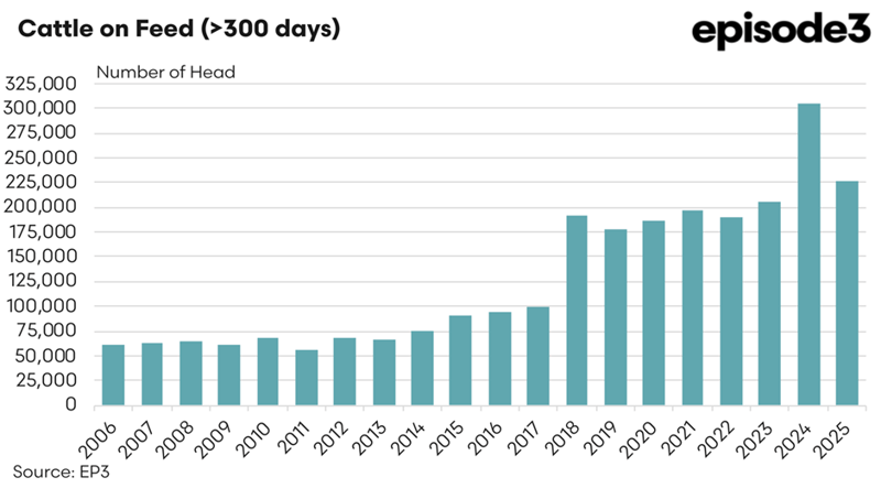 This alignment is further supported by the annual percentage change chart for cattle exceeding 300 days on feed, which illustrates a sharp contraction in 2025 following strong growth in the preceding year. The data highlights the cyclical nature of premium beef production, where extended feeding programs expand rapidly during periods of favourable margins and contract when profitability comes under pressure.