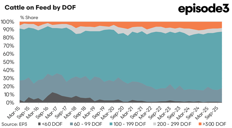 Additional insight is provided by the Cattle on Feed by DOF chart, which shows the distribution of feeding durations across Australian feedlots. Cattle fed between 100 and 199 days dominate the system, while the share of cattle exceeding 300 days on feed remains relatively small but highly influential. Changes within this long-fed category have a disproportionate impact on overall feeding averages. The decline in the greater than 300 day segment during 2025 closely mirrors the fall in Wagyu numbers estimated by EP3, reinforcing the conclusion that Wagyu production trends were the primary factor behind the reduction in average days on feed.