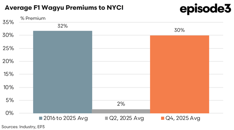 The underlying catalyst for this adjustment was a shift in Wagyu price premiums. The Average F1 Wagyu Premiums to NYCI chart demonstrates the volatility experienced throughout 2025. The long-term average premium for F1 Wagyu between 2016 and 2025 stood at 32%. However, during the second quarter of 2025, premiums contracted sharply to just 2%, effectively bringing F1 Wagyu prices into alignment with non Wagyu cattle. This compression significantly eroded the financial incentive to commit cattle to extended feeding programs, prompting producers and feedlot operators to reassess placements and feeding durations.