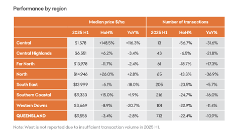 Queensland farmland values eased through the first half of 2025, with the median price falling 3.4 per cent to $9,558/ha, which was down 2.8 per cent year-on-year but still the third-highest half-yearly level on record.