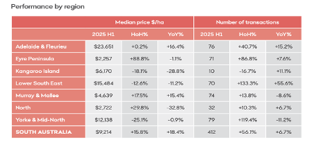 Despite subdued demand for grazing and cropping land, transaction volumes surged 56.1 per cent half-on-half in South Australia and 6.7 per cent year-on-year to 412 sales, which is the highest level since early 2023.