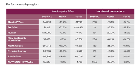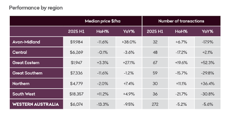 Regional median price results were mixed in the first half of 2025, with the North West and North falling 3.3 per cent and 16.7 per cent respectively, while the South lifted 44.6 per cent to $13,941/ha.