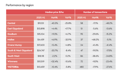 Farmland values in Victoria softened notably in the first half of 2025, with the median price declining 10.4 per cent to $13,659/ha.