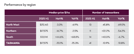 Tasmanian farmland values weakened through the first half of 2025, with the median price falling 20.1 per cent to $17,575/ha and down 25.3 per cent year-on-year.