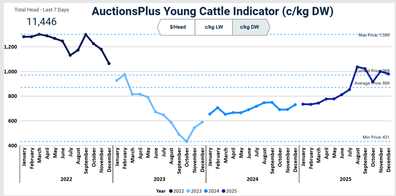 The AuctionsPlus Young Cattle Indicator (AYCI) recorded strong gains throughout 2025, peaking at 1,035c/kg DW in August.