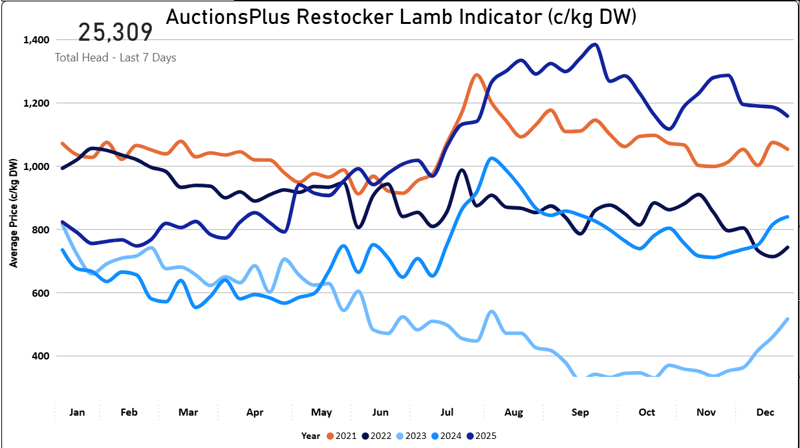 The AuctionsPlus Restocker Lamb Indicator (ARLI) recorded strong gains throughout 2025, reaching price levels in the second half of the year not seen in the past five years, and peaking at 1,384c/kg DW in September.